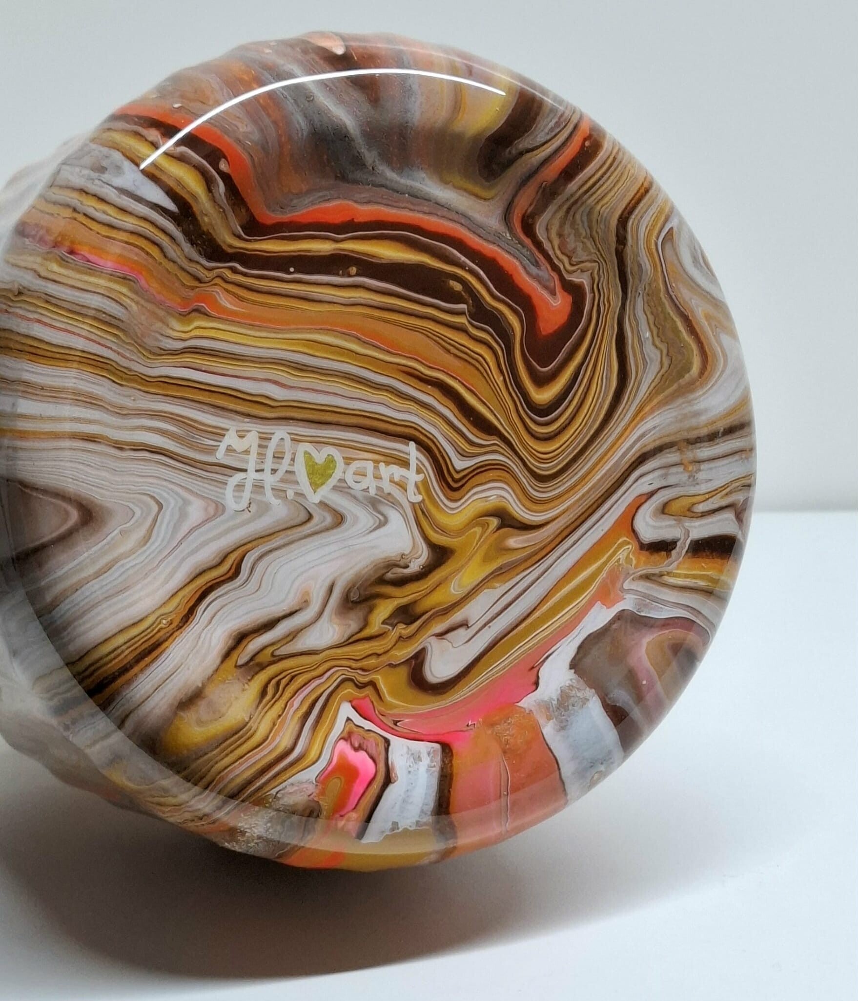 De wonderlijke creaties, kleuren en vormen die ontstaan na het gieten van de verf verbaasd ons iedere keer weer. Elk kunstobject wordt afgewerkt met verschillende lagen epoxy voor een nog mooiere uitstraling en een beschermlaag.